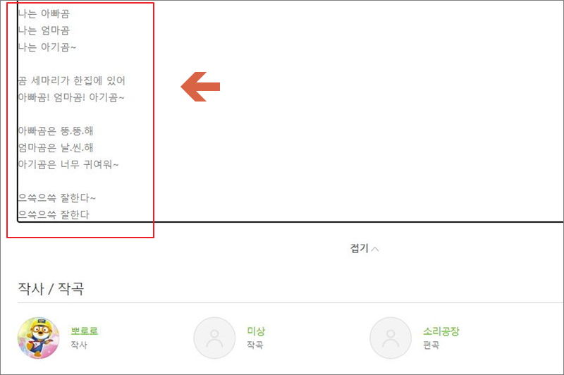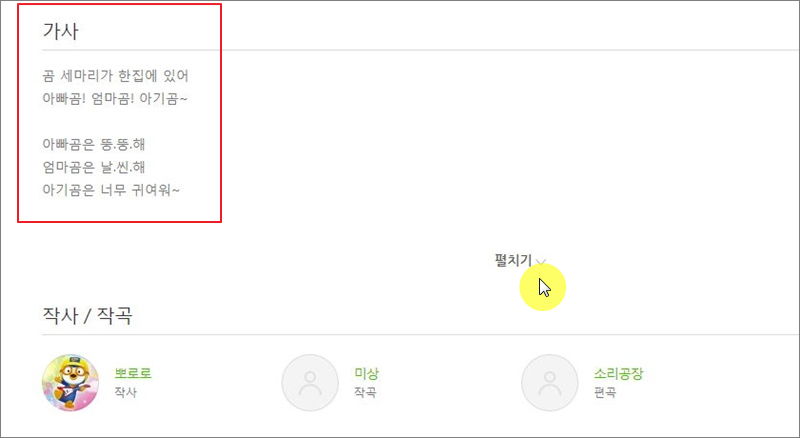 ▼ 저는 유명한 동요인 곰 세마리에 대한 가사를 찾아보았습니다. 펼치기 버튼을 누르기 전에는 이렇게 첫 부분만 확인이 가능합니다.