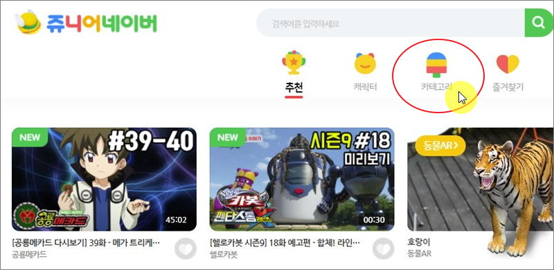 ▼ 쥬니어네이버 사이트에 접속했습니다. 화면 상단에 검색어를 입력할 수 있는 부분이 있습니다. 아이가 유독 좋아하는 동요가 있다면 검색을 해보는 것도 좋습니다. 노래모음 리스트를 만나보고 싶다면 메뉴에서 "카테고리"를 클릭하면 됩니다.