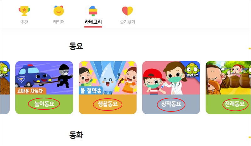 ▼ 새롭게 열린 페이지를 보면 동요 노래모음이 종류별로 나타났습니다. 놀이, 생활에 관한 곡은 물론이고, 창작이 되었거나 옛부터 내려온 전래동요 노래모음도 있습니다. 여기에서 제공하는 동요 컨텐츠의 경우 대부분 가사도 함께 볼 수 있습니다.