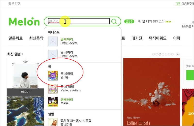 ▼ 멜론 사이트에 접속하면 가사를 얻고 싶은 동요의 제목을 검색창에 입력합니다. 해당 검색어에 관한 아티스트, 곡, 앨범 등이 나옵니다.