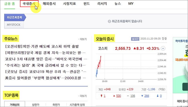 ▼ 이번에는 국내 사이트를 이용하면 개별 주식시세 보기 방법을 알려드리겠습니다. 개인적으로 국내증시를 알아보기 위해 많이 사용하는 곳은 네이버 금융입니다. 아무래도 많은 사람들이 이용하는 곳은 이유가 있습니다.
