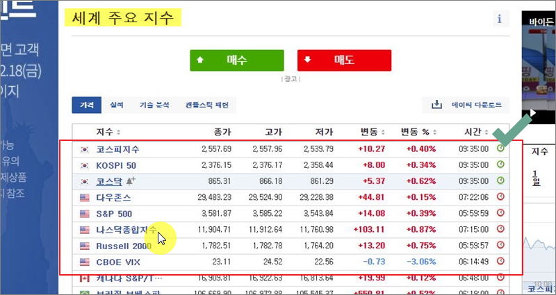 ▼ 세계 주요 지수 페이지가 열렸습니다. 여기에서는 국내 지수인 코스피와 코스닥, 미국지수인 나스닥, 다우존스 등을 보기 가능합니다.