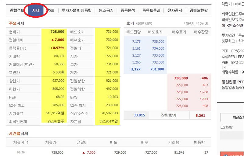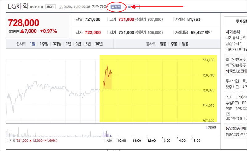 ▼ 이전 페이지에서 LG화학을 선택해 보았습니다. 해당 종목에 대한 주식시세를 자세히 살펴볼 수 있는 페이지가 열렸습니다. 장이 열린 상태에서는 실시간으로 차트가 그려지기 때문에 시세 보기 참 좋습니다.