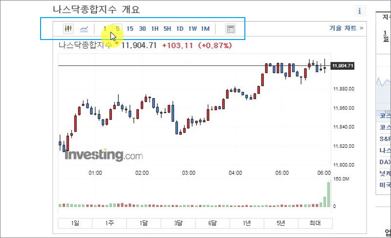 ▼ 최근 국내 주식시세에 많은 영향을 주는 나스닥종합지수를 클릭해 보았습니다. 이렇게 개별 주식 종목에 대한 차트를 보듯이 지수 차트를 이용할 수 있습니다. 해외 지수임에도 불구하고, 1분 단위로도 실시간으로 업데이트가 됩니다.