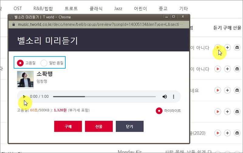 ▼ 여기서 추천하는 전화 벨소리를 미리 들어볼 수도 있습니다. 티월드의 경우 고음질과 일반 음질 이렇게 2가지 음원을 이용할 수 있습니다. 참고로 통신사 사이트에서 추천 벨소리를 이용하는 경우에는 비용이 발생합니다.