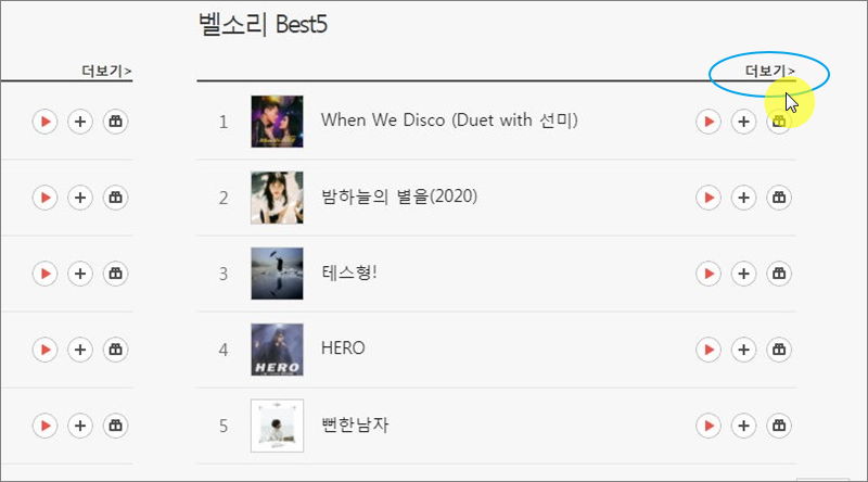 ▼ 새롭게 열린 페이지를 보면 전화 벨소리 Best 5를 살펴볼 수 있습니다. 요즘에는 When We Disco, 밤하늘의 별을, 테스형, HERO, 뻔한남자가 1위에서 5위를 차지할 정도로 인기가 많네요. 리스트 우측 상단을 보면 "더보기" 버튼이 있습니다. 해당 버튼을 클릭하면 좀 더 많은 전화 벨소리를 추천 받을 수 있습니다.