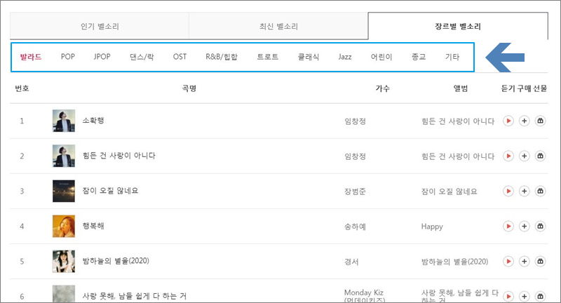 ▼ 인기가 있거나 최근에 나온 벨소리 외에도 장르별로 인기 있는 벨소리 순위를 볼 수 있습니다. 발라드, 팝, 힙합, 클래식, 째즈, 어린이 노래, 종교 음악 등 다양합니다.