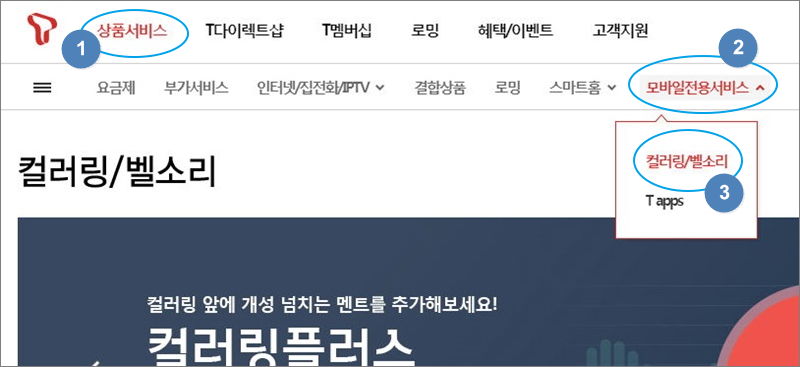 ▼ 티월드 사이트에 접속하면 메뉴에서 상품서비스를 클릭해 봅니다. 그럼 모바일 전용 서비스에 있는 "컬러링/벨소리"를 찾을 수 있습니다. 클릭해 주세요.