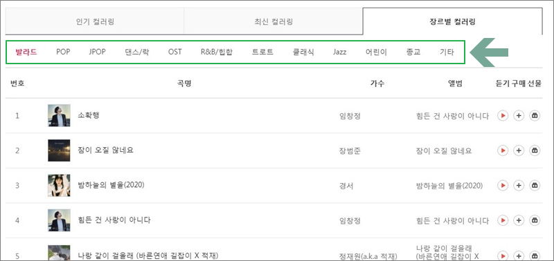 ▼ 사람마다 자신이 좋아하는 장르가 있습니다. 이곳에서는 각 장르별 컬러링으로 정하기 좋은 노래 순위를 확인할 수 있습니다. 발라드, POP, JPOP, 댄스, 락, OST, 힙합, Jazz 등 다양합니다.