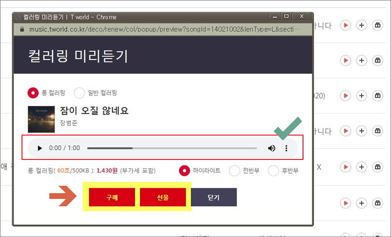 ▼ 순위를 확인하는 것 외에도 리스트에 나온 노래의 컬러링 음원을 들어보는 것도 가능합니다. 리스트 우측에 보면 재생 버튼이 있습니다. 해당 버튼을 클릭하면 2가지 버전으로 음원 듣기가 가능합니다. SKT 사용자의 경우에는 구매를 통해 컬러링으로 설정도 바로 할 수 있습니다. 좋아하는 사람이 있다면 선물 기능도 있으니 활용해 보시길 바랍니다.
