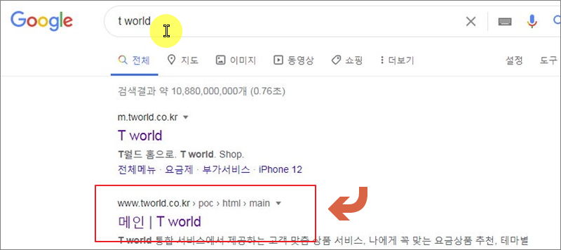 ▼ 티월드 사이트에 접속했습니다. 이곳에서는 여러 가지 컬러링과 벨소리에 들어가는 곡의 순위를 살펴볼 수 있습니다. skt 통신사를 이용하는 경우라면 티월드에서 컬러링과 벨소리 설정도 가능합니다. 그럼 인기 노래 순위를 보기 위해 메뉴에서 "상품서비스"와 "모바일전용서비스"를 클릭합니다. 그럼 "컬러링/벨소리" 서비스를 찾을 수 있습니다.