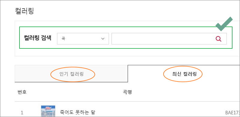 ▼ 이곳에서는 인기 컬러링과 최신 컬러링 노래를 알아볼 수 있습니다. 더 나아가 컬러링으로 사용하고 싶은 곡을 검색하는 것도 가능하죠.