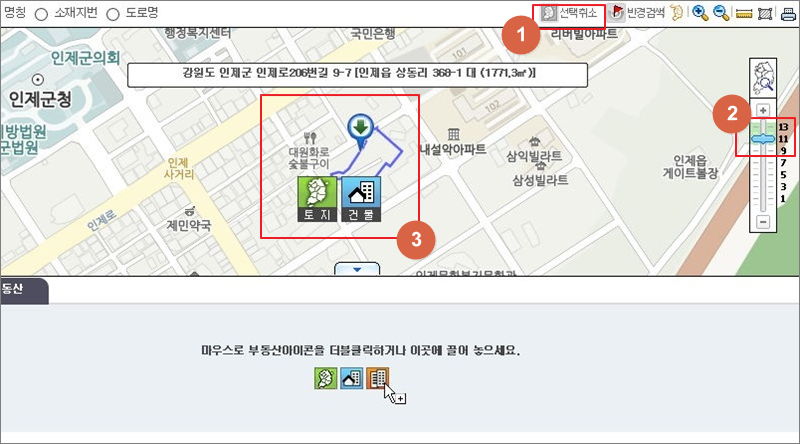 ▼ 지도 화면이 나타났습니다. 등기부등본 인터넷발급을 진행하려면 지도 화면을 확대해야 합니다. 11단계까지 확대를 한 후 우측 상단에 있는 "선택" 버튼을 클릭합니다. 해당 버튼을 한 번 클릭한 상태에서 등기부등본이 필요한 부동산 위치를 클릭합니다. 그럼 토지 또는 건물 아이콘이 나타납니다. 아이콘 중에서 하나를 아랫쪽으로 끌어 놓습니다.