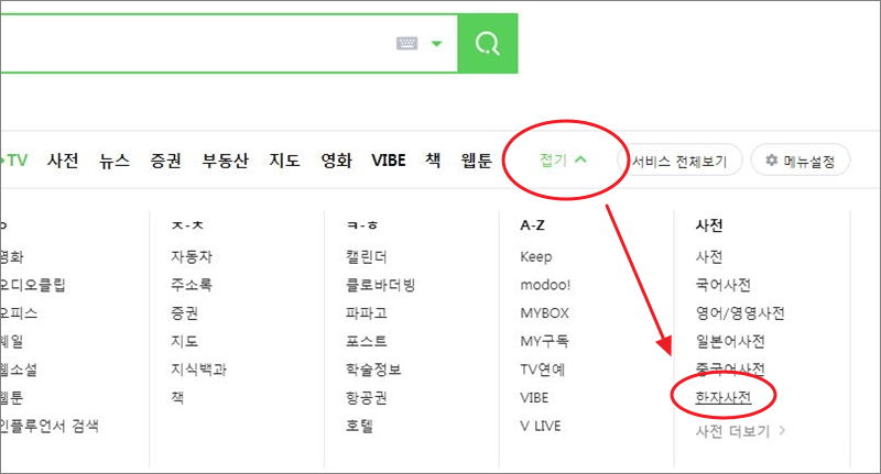▼ 국내에서 많은 이용자를 자랑하는 네이버 사이트에서 바로 한문 번역기 서비스로 이동이 가능합니다. 네이버 홈페이지 메인화면에 보면 메뉴에서 오른편에 "더보기" 버튼이 있습니다. 해당 버튼을 클릭하면 네이버에서 제공하는 전체 서비스를 확인할 수 있죠. 우리가 찾는 서비스는 사전 카테고리에 있는 "한자사전" 입니다.