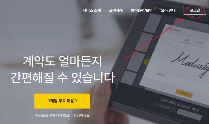 ▼ 전자계약 서비스를 제공하는 모두싸인 홈페이지에 접속했습니다. 온라인 도장 만들기 프로그램을 사용하려면 해당 사이트에서 로그인을 해야 합니다. 1분 이내에 회원가입이 가능할 정도로 쉽게 할 수 있으니 부담을 느끼지 않으셔도 됩니다.