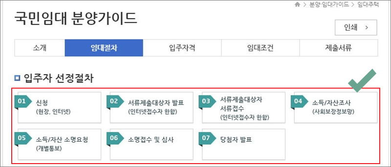 국민임대 분양가이드를 보면 이에 대한 소개, 임대절차, 임주자격, 임대조건, 제출서류에 대한 정보가 나와 있습니다. 모두가 임대아파트에 신청할 수 있는 것은 아니기 때문에 임대아파트 신청에 앞서 자격조건을 꼭 확인하는 것이 좋습니다.