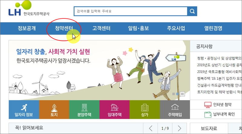 LH주택공사 사이트에 접속했습니다. 메인화면을 보면 정보공개, 청약센터, 고객센터, 주요사업, 알림, 홍보 등 여러 가지가 있습니다. 메인화면 중앙에는 임대아파트에 대한 서비스 버튼도 나와 있네요.