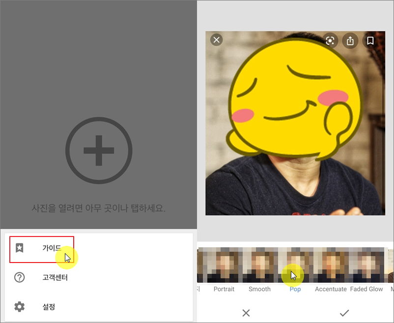 ▼ 그럼 스냅시드 어플을 실행해 보았습니다. 구글 플레이 스토어나 애플의 앱스토어에서 snepseed를 검색하면 무료로 설치할 수 있습니다. 처음 실행하면 중앙에 버튼 하나가 나타납니다. 해당 버튼을 누르고 꾸미기를 하고 싶은 사진을 선택하면 됩니다. 스마트폰 사진 꾸미기를 해본 적이 없는 분의 경우에는 우측 상단에 있는 메뉴 버튼을 클릭한 후 [가이드]를 클릭해 보세요. 그럼 좀 더 멋진 사진을 만드는 데에 도움이 될 만한 정보가 있을 겁니다.