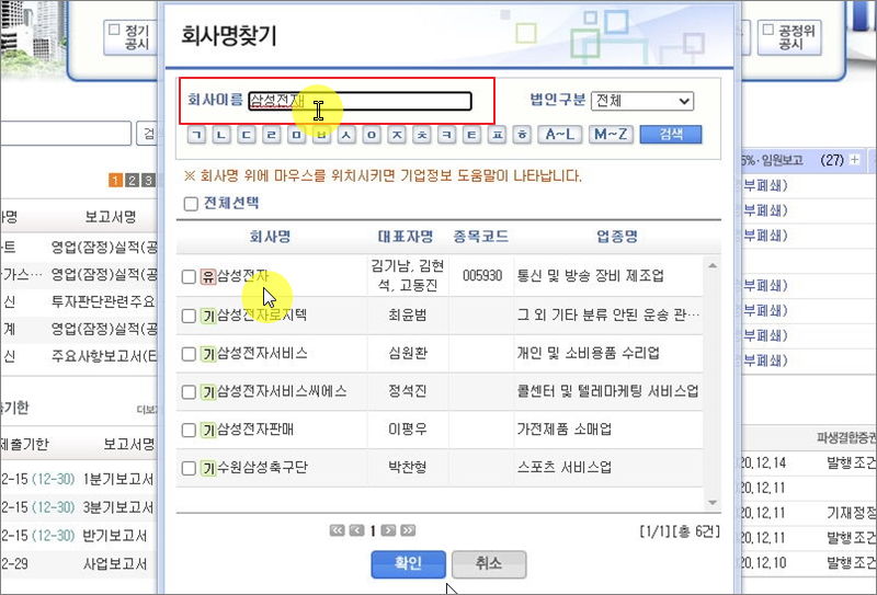 누구나 알만한 "삼성전자"를 검색해 보았습니다. 대부분이 생각하는 삼성전자도 나오지만, 해당 키워드를 포함한 회사명도 많이 나오네요. 여기서 알아보고자 하는 상호를 검색한 후 회사명을 마우스로 클릭해 주세요.
