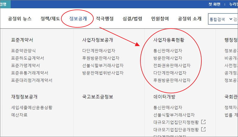 공정거래위원회 홈페이지에 접속했습니다. 메뉴에서 [정보공개]를 클릭해 보세요. 그럼 사업자등록현황 카테고리가 보일 겁니다. 해당 카테고리에 속한 사업자의 경우 상호로 사업자등록번호 조회가 가능합니다. 통신판매사업자, 방문판매사업자, 전화권유판매사업자, 다단계판매사업자, 후원방문판매사업자 이렇게 5가지 종류입니다.