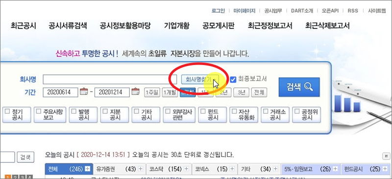 다시 전자공시시스템 메인화면으로 돌아왔습니다. 중앙에 있는 검색 영역을 보면 회사명이 입력되어 있는 것을 확인할 수 있습니다. 이 상태에서 검색 버튼을 클릭해 주세요.