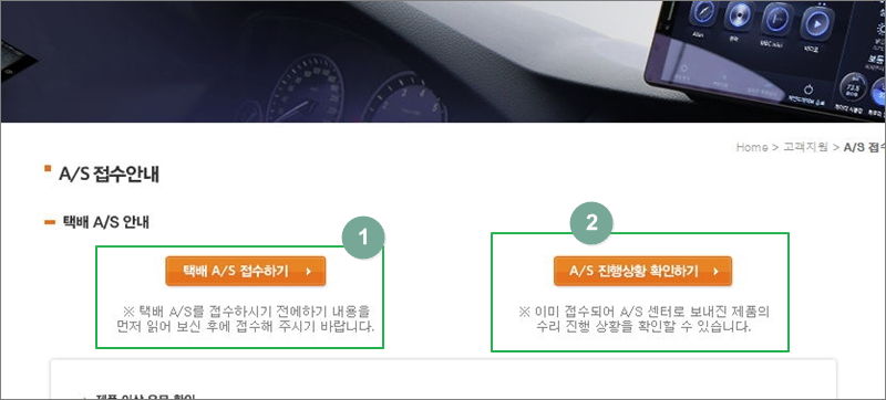 파인드라이브 고객센터의 경우 택배 A/S를 진행하고 있는데요. 무작정 택배로 보내면 안돼요. 여기서 접수하기 버튼을 클릭해서 진행해야 해요. 진행상황도 여기에서 확인할 수 있어요. 그리고 접수하기 전에 확인해야 할 사항이 있는데요. 다음 단계에서 알려드릴게요.