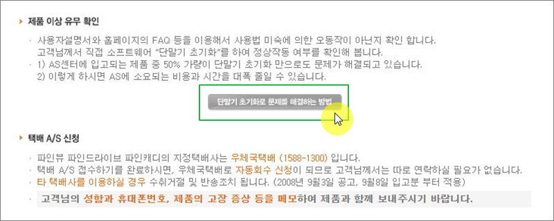 고객센터에 입고되는 제품 중에서 절반 정도는 초기화 만으로 문제 해결이 가능하다고 해요. 그렇기 때문에 확실하게 파인드라이브 기기가 고장 났다고 판단되는 것이 아니라면 초기화를 해보는 것이 좋아요. 그럼 시간이 낭비되는 것도 줄일 수 있고, 택배 비용도 아낄 수 있어요. 참고로 파인드라이브 고객센터에 택배를 보낼 때에는 지정택배사를 이용해야 하는데요. 지정택배사는 우체국택배에요. 사이트에서 A/S 접수하기를 진행 완료하면 우체국택배로 자동회수 신청이 된다고 해요. 그렇기 때문에 고객 입장에서 따로 우체국 택배로 연락할 필요는 없어요.