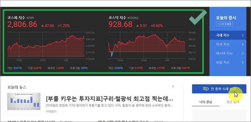 사이트에 접속하면 메인화면을 통해 오늘의 증시 정보를 확인할 수 있어요. 주식에 관심을 갖고 있다면 국내 지수는 기본으로 숙지하는 것이 좋은데요. 코스피와 코스닥이 몇 달간 꽤 많이 올랐네요. 이러한 지수와 개별 종목의 시세가 서로 영향을 주기 때문에 필히 확인하는 것이 좋아요. 메인화면에서 중앙 우측에 있는 "전 종목시세보기"를 클릭해 보세요.