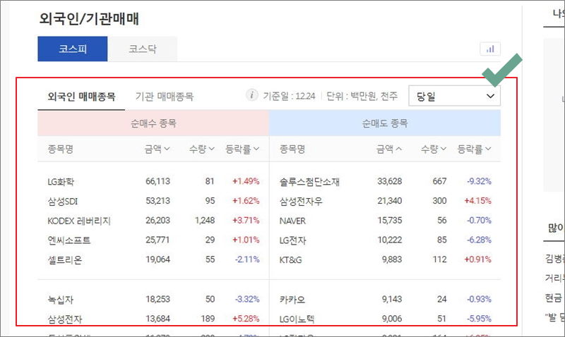외국인 및 기관 매매 종목에 관한 페이지가 열렸어요. 보시는 바와 같이 기간을 설정하면 해당 기간 동안 순매수 또는 순매도한 종목에 대해 알아볼 수 있어요. 간단하게 종목명, 금액, 수량, 등락률 등이 나오는데요. 종목명을 누르면 좀 더 자세한 종목시세 보기를 할 수 있어요.
