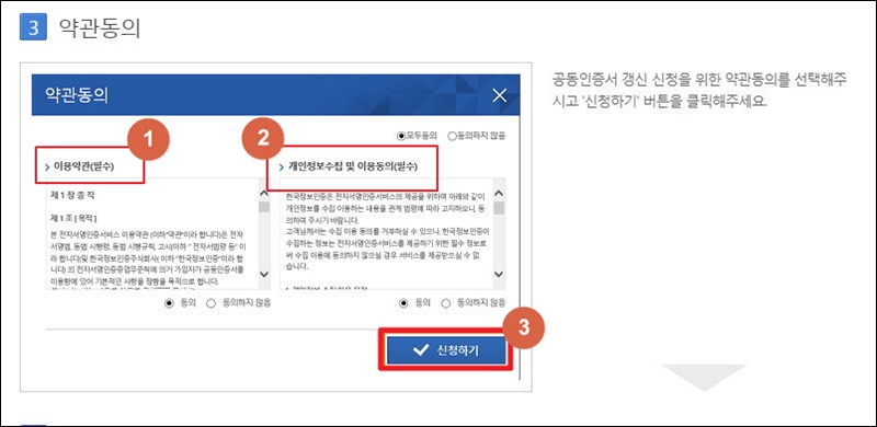 이번에는 한국정보인증에서 안내하는 약관에 동의할 차례에요. 꼼꼼히 읽어보고 동의해주세요. 필수 항목에 대한 동의가 없이 공인인증서 진행할 수 있는 갱신 방법은 없어요.