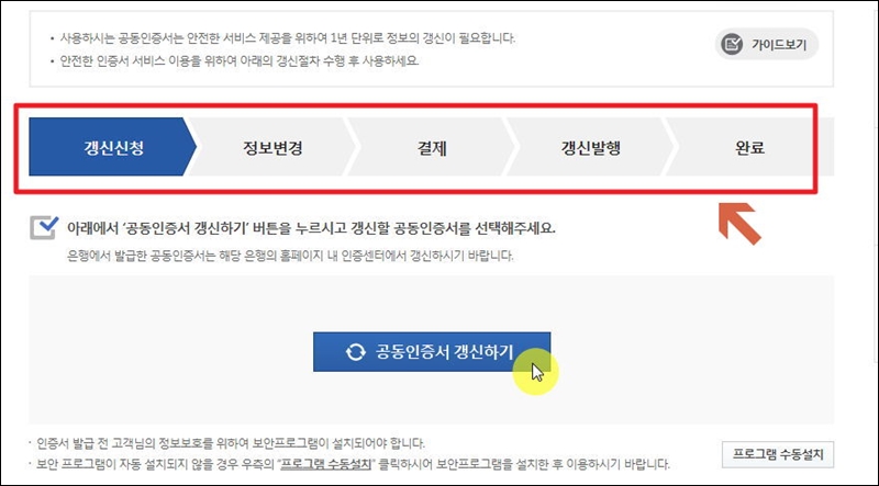 수수료 결제의 경우 다양한 방법으로 결제 진행이 가능한데요. 신용카드, 휴대폰 결제, 실시간 계좌 이체, 가상계좌이체 중에서 마음에 드는 결제 방법을 선택한 후 진행해 주세요. 결제까지 진행하면 공인인증서 갱신 프로세스가 시작되는데요. 1분에서 5분 정도 걸리니 해당 시간 동안 브라우저를 닫지 말아주세요.