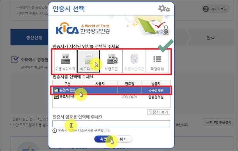 갱신을 진행할 공인인증서를 선택할 차례에요. 인증서가 저장된 위치를 선택해 주세요. 보통 하드디스크와 이동식디스크를 많이 하죠. 하나씩 클릭해 보면 해당 위치에 있는 인증서를 찾을 수 있을 거에요. 그렇게 해서 찾은 인증서를 선택한 다음 암호 입력후 "확인" 버튼을 눌러주세요.