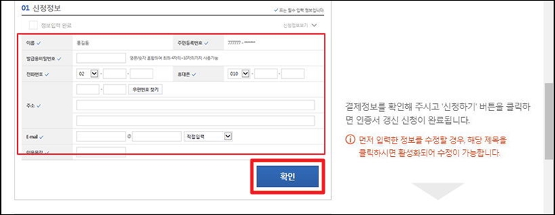 동의 후에는 신청자에 대한 정보를 입력할 차례에요. 이름, 전화번호, 주소, 이메일 주소 등 주요 항목을 모두 입력해 주세요.