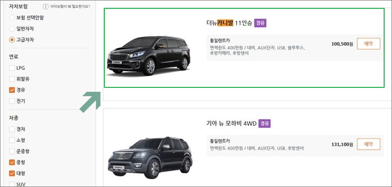 제주도에서 카니발을 모는 경우에는 티몬 사이트에서 이용할 수 있는 "제주 실시간 렌터카 검색" 기능을 사용해 보세요. 카니발 외에 많은 차량을 이용하고 싶을 때 쉽게 렌트비용을 비교할 수 있어요. 대여일과 반납일을 지정할 수 있기 때문에 1일에서부터 그 이상의 기간을 비교할 수도 있죠. 카니발을 찾아보려면 좌측에 있는 메뉴에서 연료를 경유, 차종을 경유로 지정하면 돼요.