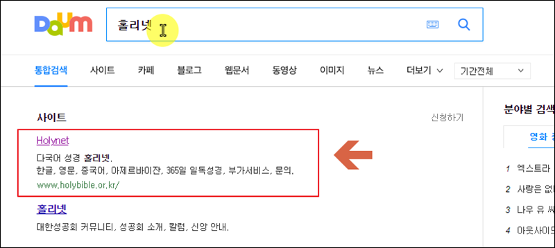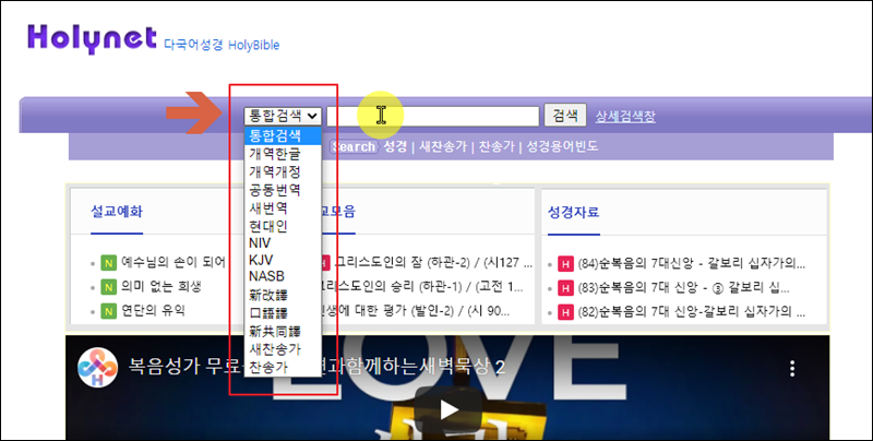 홀리넷 사이트 중앙 상단에 있는 검색창을 이용하면 간단히 성경구절 찾기가 가능한데요. 영어로 검색하려면 통합검색을 클릭한 후 NIV, KJV, NASB 중에 하나는 선택하시면 됩니다.