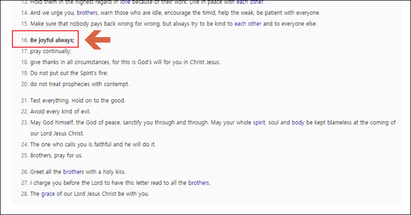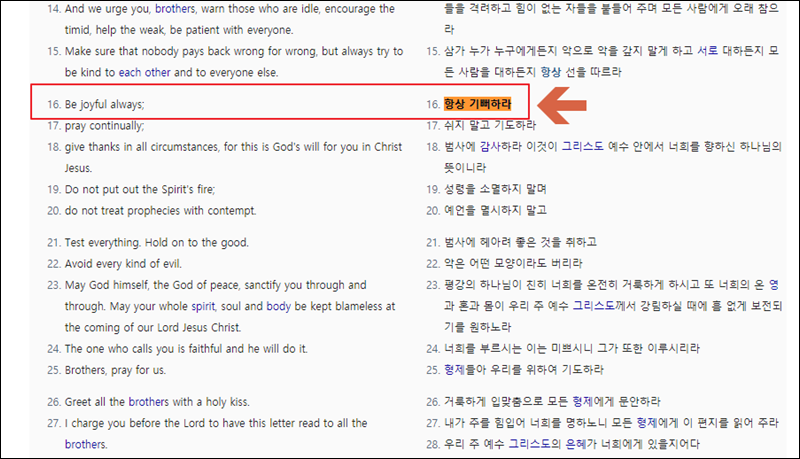 저는 한글로 찾는 것이 편해서 한글로 성경구절을 검색해 보았습니다. 이렇게 찾은 한글 성경구절에 대하여 영문으로 확인할 수 있습니다. 일단 본인이 찾고자 한 구절을 찾아서 클릭해 보세요.