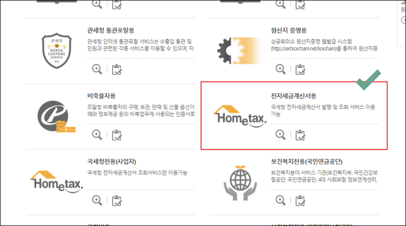 새롭게 열린 페이지를 보시면 아시겠지만, 꽤 많은 사업자 전용 공동인증서 상품이 나타났는데요. 여기서 중앙 우측에 보면 전자세금계산서용 공동인증서를 찾을 수 있어요. 국세청 전자세금계산서 발행 및 조회 서비스를 이용할 수 있다고 하네요.