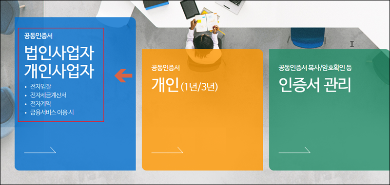 처음 사이트에 접속하면 개인 또는 사업자를 선택하는 부분이 나와요. 개인사업자, 법인사업자 부분을 보시면 전자세금계산서가 보이실텐데요. 해당 메뉴를 클릭해 주세요. 이 외에도 전자입창, 전자계약, 금융서비스에 관한 공동인증서도 발급 받을 수 있으니 참고하시길 바랍니다.