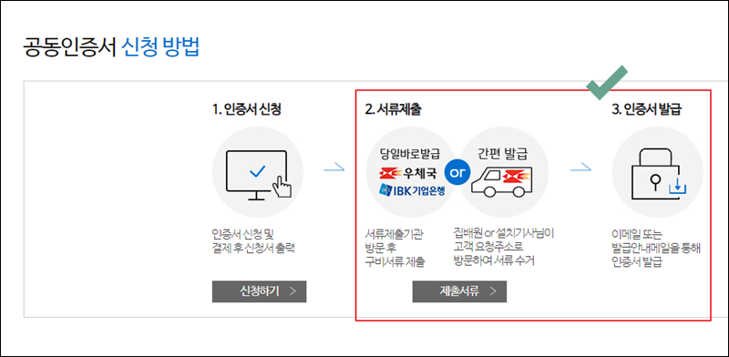 인터넷으로 신청을 했다고 해서 다 끝난 것은 아니에요. 서류를 제출해야 하는데요. 우체국이나 기업은행에 본인이 직접 방문하여 구비서류를 제출해도 되고요. 간편 발급 서비스를 이용하는 경우에는 집배원 또는 설치기사님의 방문을 요청할 수 있어요. 서류를 제출하고 나면 이메일을 통해 인증서 발급을 완료할 수 있고요.