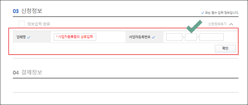 사업자 전용 공동인증서를 신청할 때에는 업체명과 사업자등록번호 입력이 필요한데요. 빈 칸을 채워 넣기만 하면 돼요. 마지막으로 수수료 결제를 진행하면 신청 완료에요.