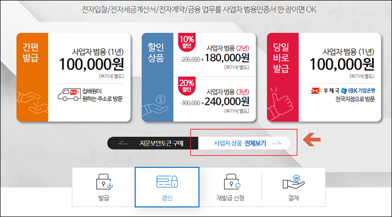 사업자 전용 공동인증서 서비스 페이지에 접속했어요. 범용인증서가 메인이기 때문에 대표적으로 나타나있는데요. 간편 발급도 가능하고, 당일 바로 발급도 가능하다고 하네요. 범용은 다음에 진행하는 방법을 알려드릴게요. 이번에는 전자세금계산서 공동인증서를 발급 받기 "사업자 상품 전체보기"를 클릭해 주세요.