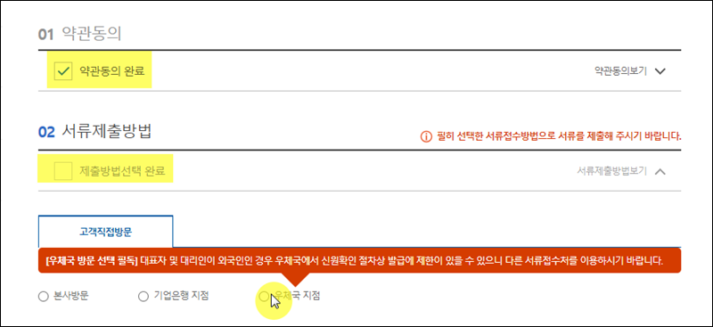 전자세금계산서 공동인증서에 대한 신청를 하는 것은 간단해요. 일단 사이트에서 볼 수 있는 약관을 읽어본 후 동의를 해주시고요. 서류 제출을 위해 방문하고자 하는 기업은행 지점이나 우체국 지점을 선택해 주세요.