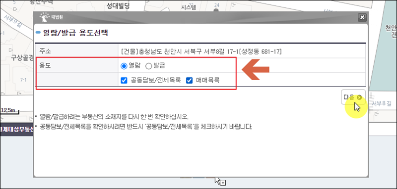 창이 새롭게 하나 열릴텐데요. 여기에서 용도를 선택합니다. 열람과 발급 중 하나를 선택하면 되는데요. 매매목록이나 공동담보, 전세목록의 경우에는 무료열람 대상이 아닙니다. 해당 부분까지 확인하고 싶다면 수수료 결제를 하셔야 해요.