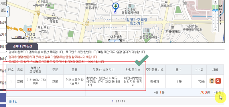 마지막으로 결제 페이지가 나타나는데요. 인터넷으로 등기부등본을 열람하려고 하는 대상이 맞는지 부동산 관련 정보를 꼼꼼히 살펴봅니다. 그 다음 결제 버튼을 누르고 수수료를 납부하면 됩니다. 그럼 인터넷으로 등기부등본을 확인할 수 있습니다.