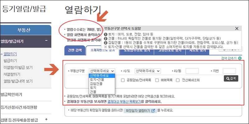 참고로 여기에 나와 있듯이 등기부등본을 인터넷으로 열람하는 데에는 700원의 수수료가 발생합니다. 발급수수료는 1000원이고요. 등기부등본 무료열람을 위해 가장 먼저 해야 할 일은 부동산 주소를 입력하는 것입니다. 토지, 건물, 집합건물 이렇게 3가지로 부동산 구분이 가능한데요. 이에 대한 것도 선택해 주세요.
