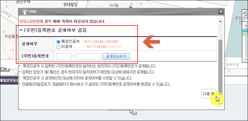 등기부등본에는 특정인에 대한 주민번호가 나올 수 있는데요. 해당 부분을 미공개로 하고 싶으면 공개여부에서 "미공개"를 선택하면 됩니다.