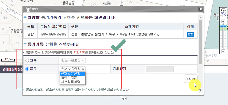 이번에는 등기기록 유형을 선택해 주세요. 현재소유현황, 특정인지분, 지분취득이력 등을 선택할 수 있습니다.