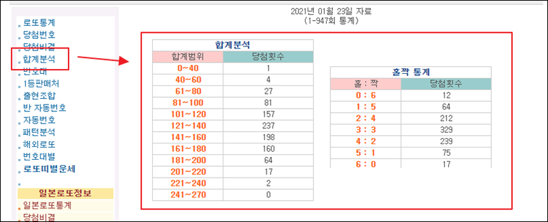 이번에는 합계분석 통계자료를 이용해 볼게요. 6개의 숫자를 모두 합한 값을 가지고 분석한 결과인데요. 121에서 140사이가 가장 많네요. 홀수 3개와 짝수 3개인 경우가 가장 많고요.