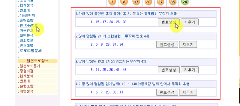 지금까지 조회한 통계자료를 편하게 활용할 수도 있는데요. "반 자동번호" 서비스를 이용하면 가장 많이 출현한 홀짝 통계, 2자리 조합, 로또당첨번호, 합계 범위를 감안한 숫자를 추천 받을 수 있습니다. 본인이 직접 분석할 시간이 없을 때 이용하면 좋아요.