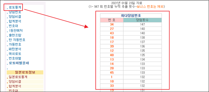 여기서는 다른 통계자료에 대한 조회도 가능한데요. 1회부터 947회까지 번호별 당첨횟수에 대한 전체보기가 가능합니다. 지금까지 34번, 27번, 43번, 18번이 많이 나왔었네요.